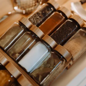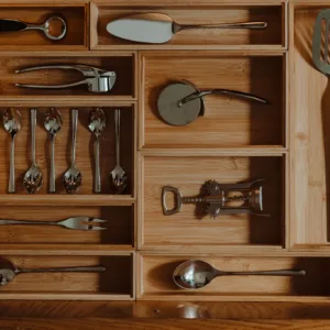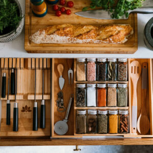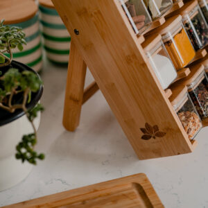 W kuchni niezastąpiony będzie bambusowy stojak na przyprawy, który pozwala na wygodne przechowywanie ulubionych przypraw. Jeśli preferujesz ukryte rozwiązania, wybierz organizer na przyprawy do szuflady – idealny do zachowania porządku i łatwego dostępu do przypraw podczas gotowania. Do serwowania przekąsek polecamy bambusową deskę do serwowania serów i przekąsek, która łączy naturalny wygląd z funkcjonalnością.