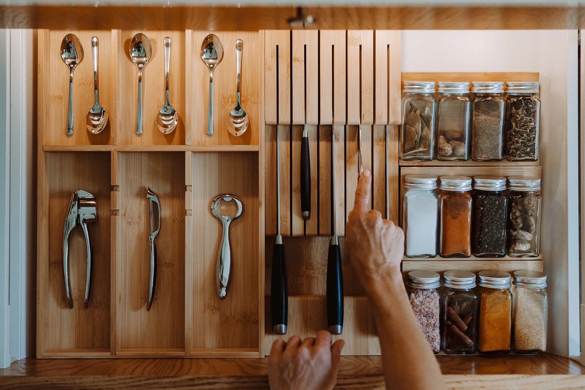 Naturalne drewno bambusowe (pełny korpus oraz spód pojemnika) ma ciepły, uniwersalny wygląd, który wprowadza harmonię do szuflad i sprawia, że aż chce się gotować. To materiał odnawialny, więc wybierasz rozwiązanie estetyczne i bardziej przyjazne środowisku.