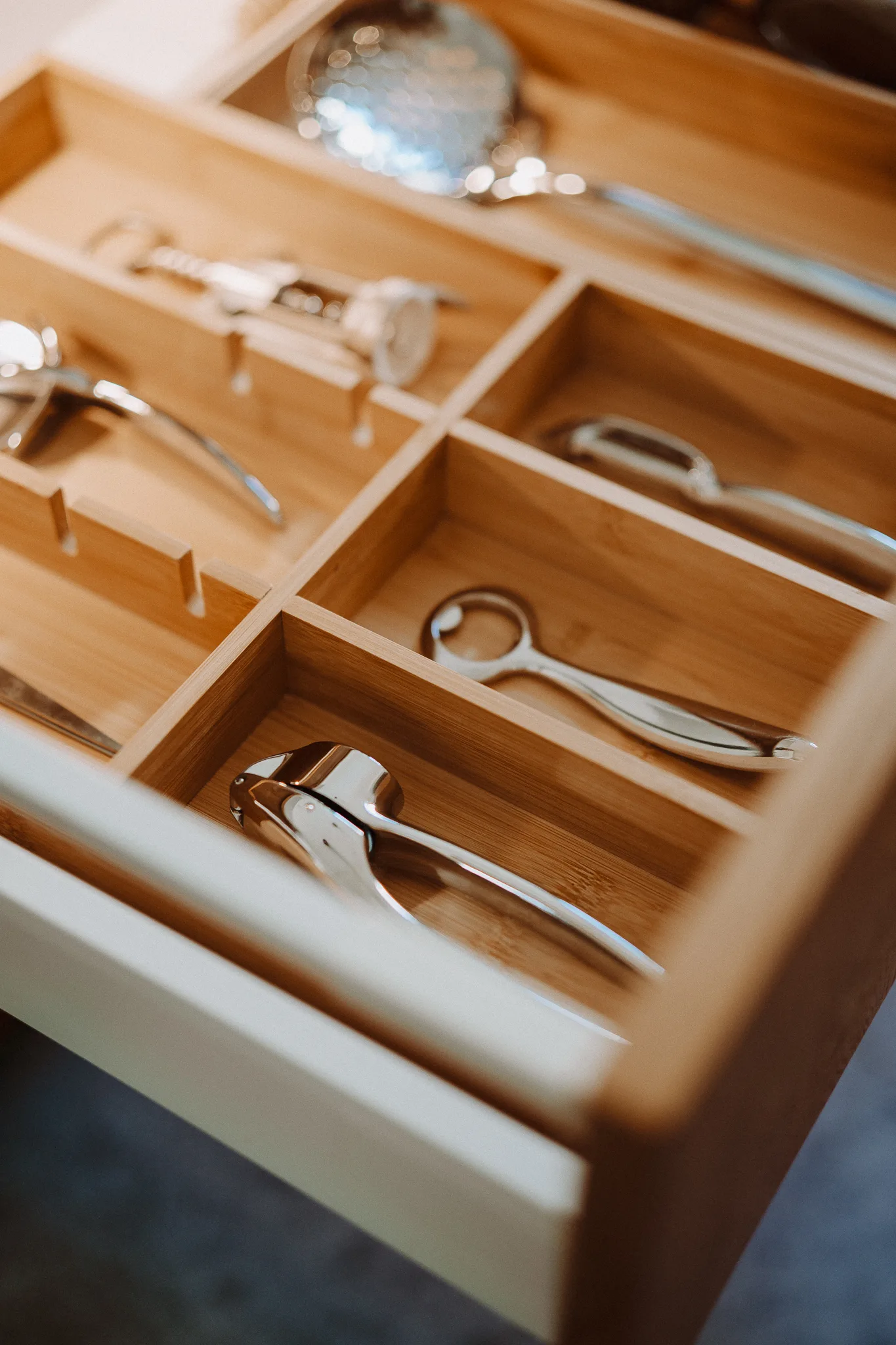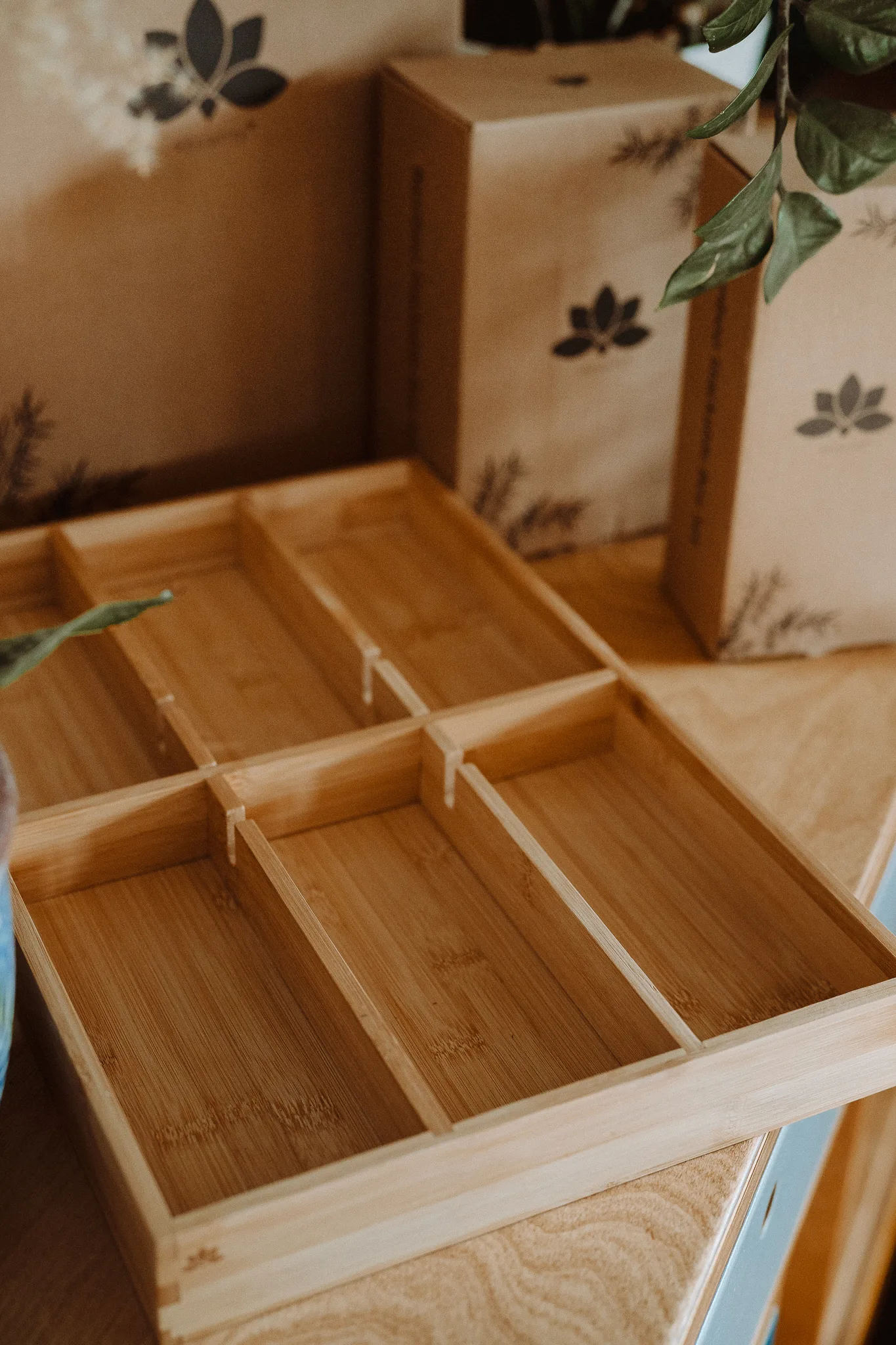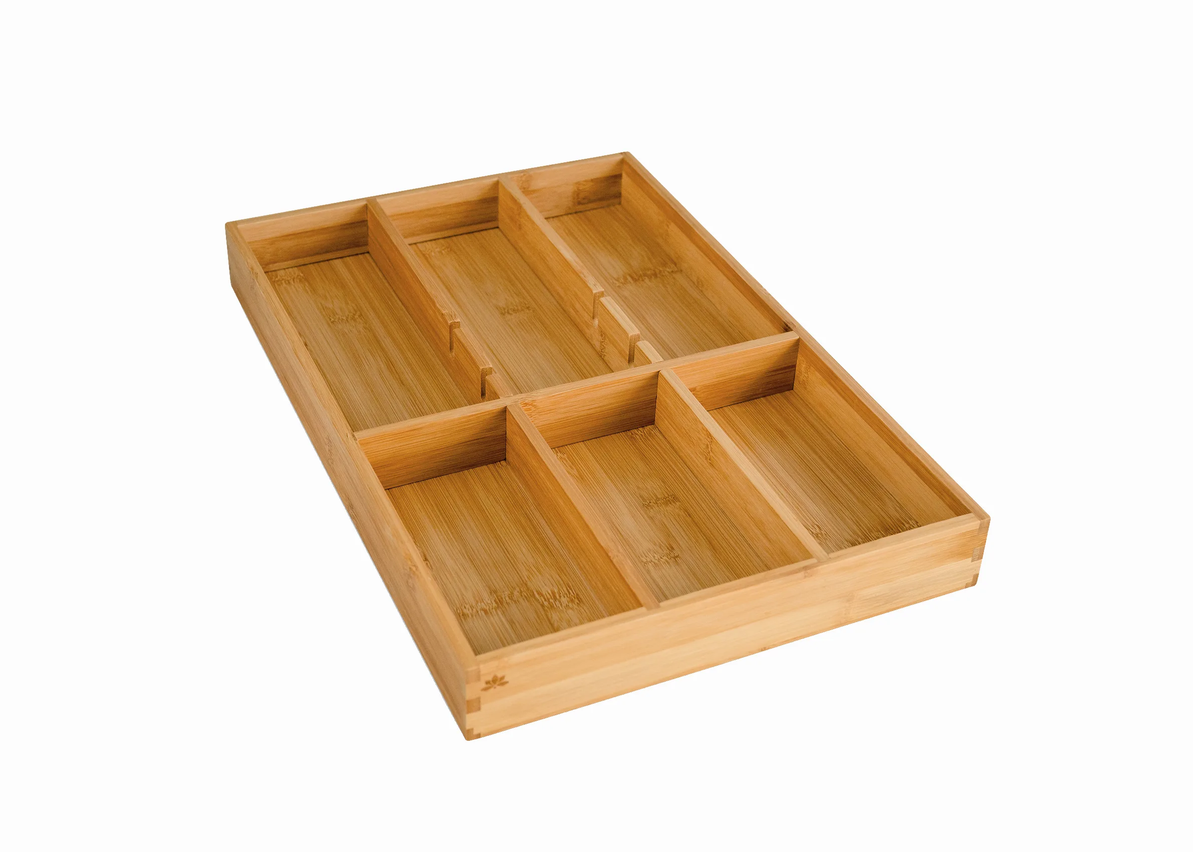 1× bambusowy organizer do szuflady z ruchomą przegrodą.