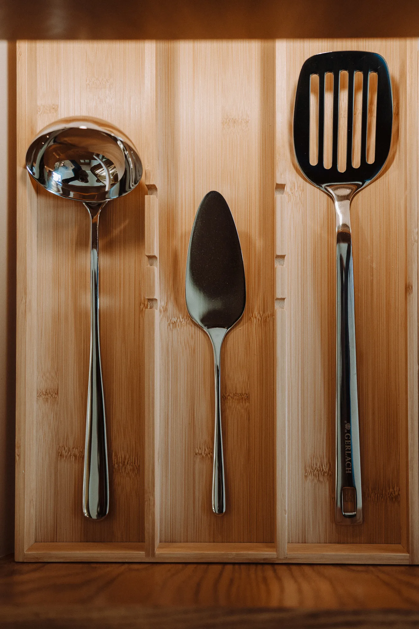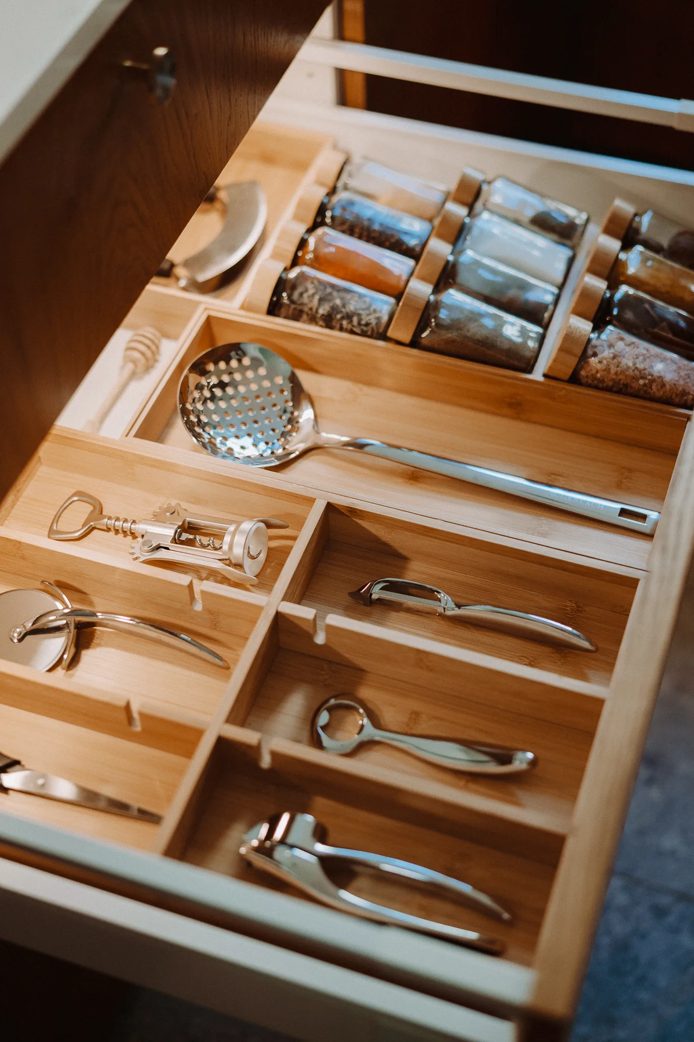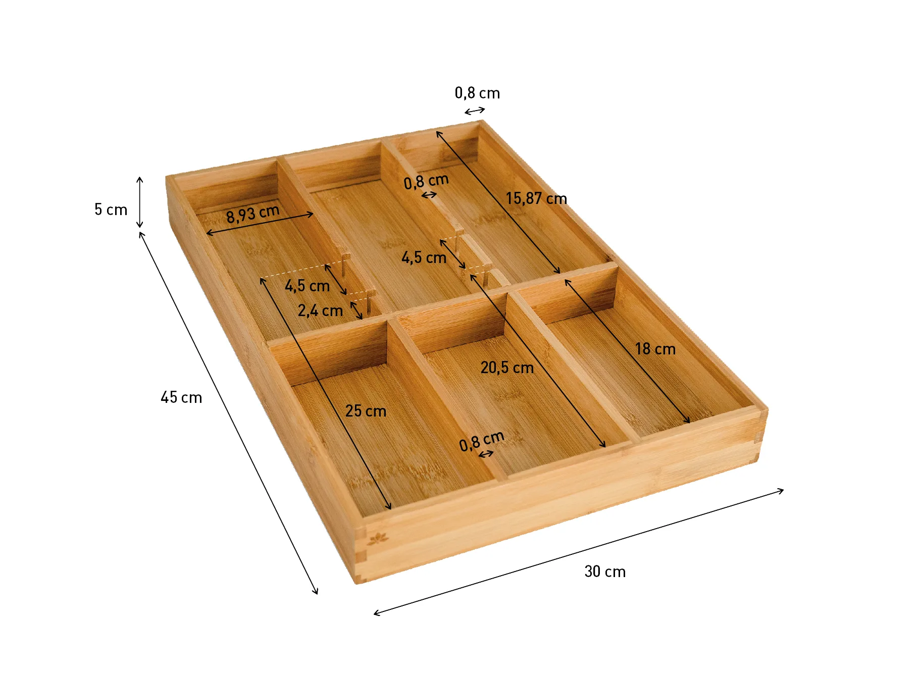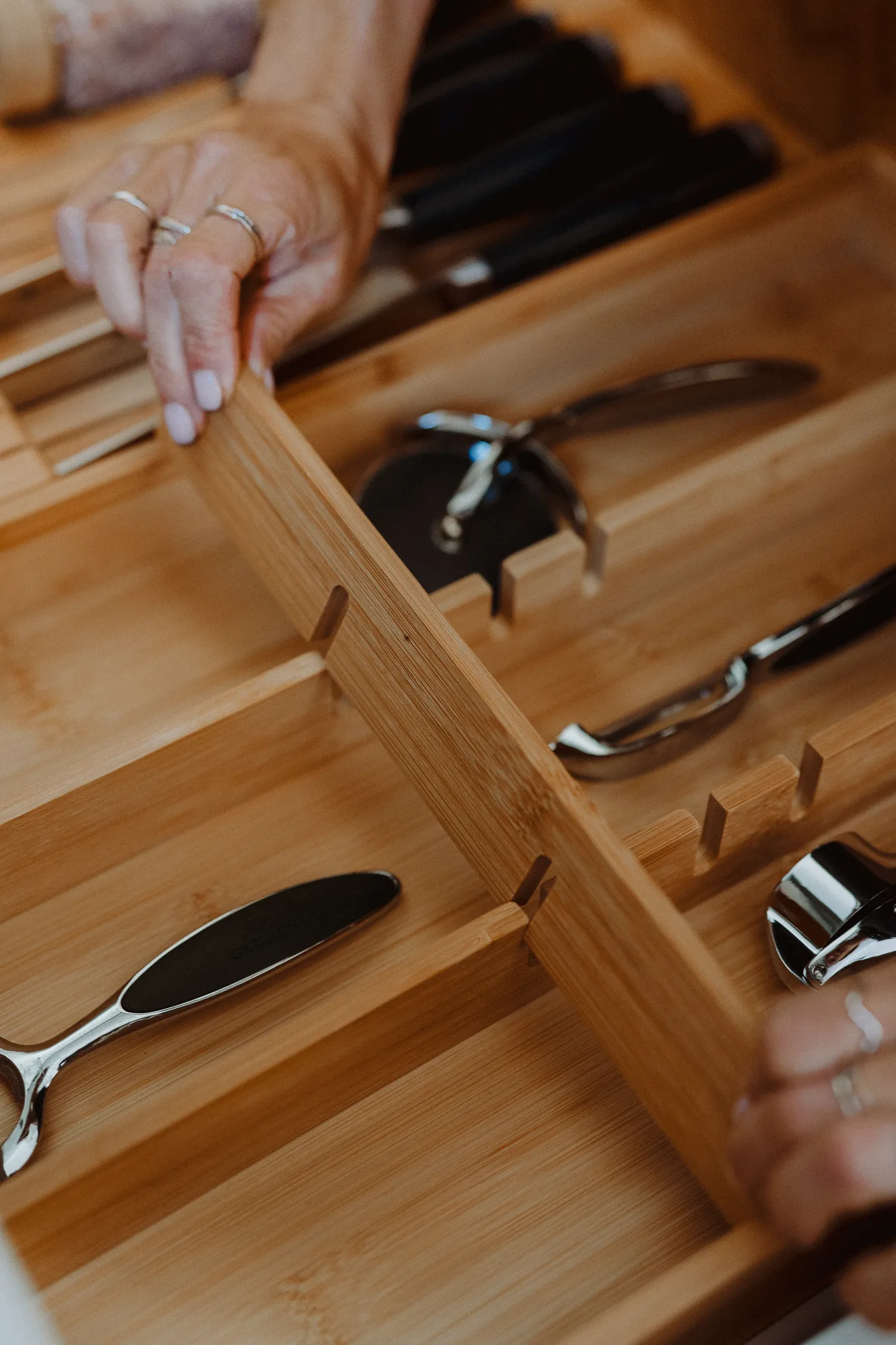 1× bambusowy organizer do szuflady z ruchomą przegrodą.
