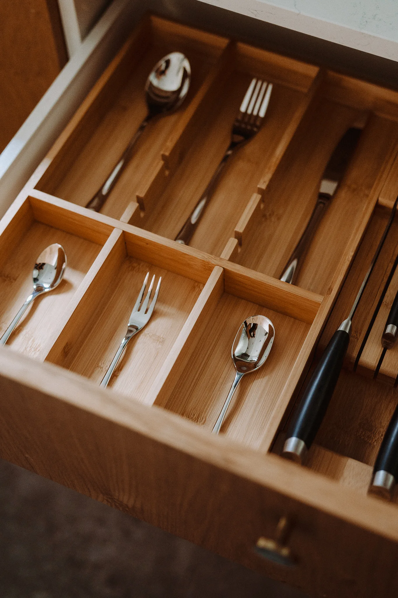 Chcesz, żeby Twoja kuchnia była funkcjonalna i stylowa? Bambusowy organizer na sztućce Veliatte® ogarnie chaos w szufladach i doda wnętrzu elegancji. Ten wkład porządkuje sztućce i przybory, dzięki czemu szybciej znajdujesz to, czego potrzebujesz.